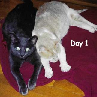 Away from my husband, I appreciated the company. My neighbor told me “Charlie” and his buddy “Oscar” lived in the back of the complex. While there is much more to this story, we decided to take in Charlie, now called “Splashes” and, at my husband’s insistence, Oscar, now called “Slurpy”. They were buddies - you can’t break up the team. In this, he could not have been more right.